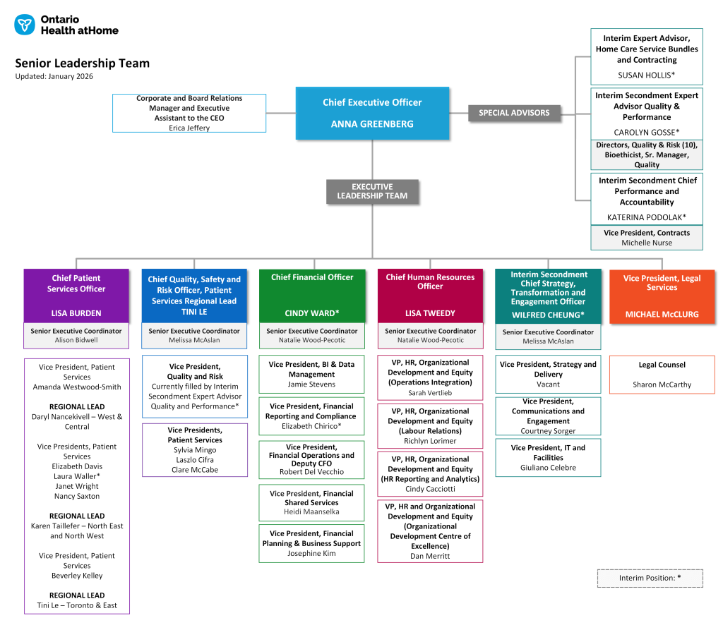 The Corporate Services portfolio provides direction and oversight for financial planning and reporting, payroll, procurement, business intelligence and data analytics, privacy and health information management. The team defines and drives financial and corporate programs, policies, systems, services and models that support patient services and Ontario Health atHome’s overall mandate and mission, vision and values. This portfolio also ensures organizational efficiency, effectiveness, fairness and transparency.
