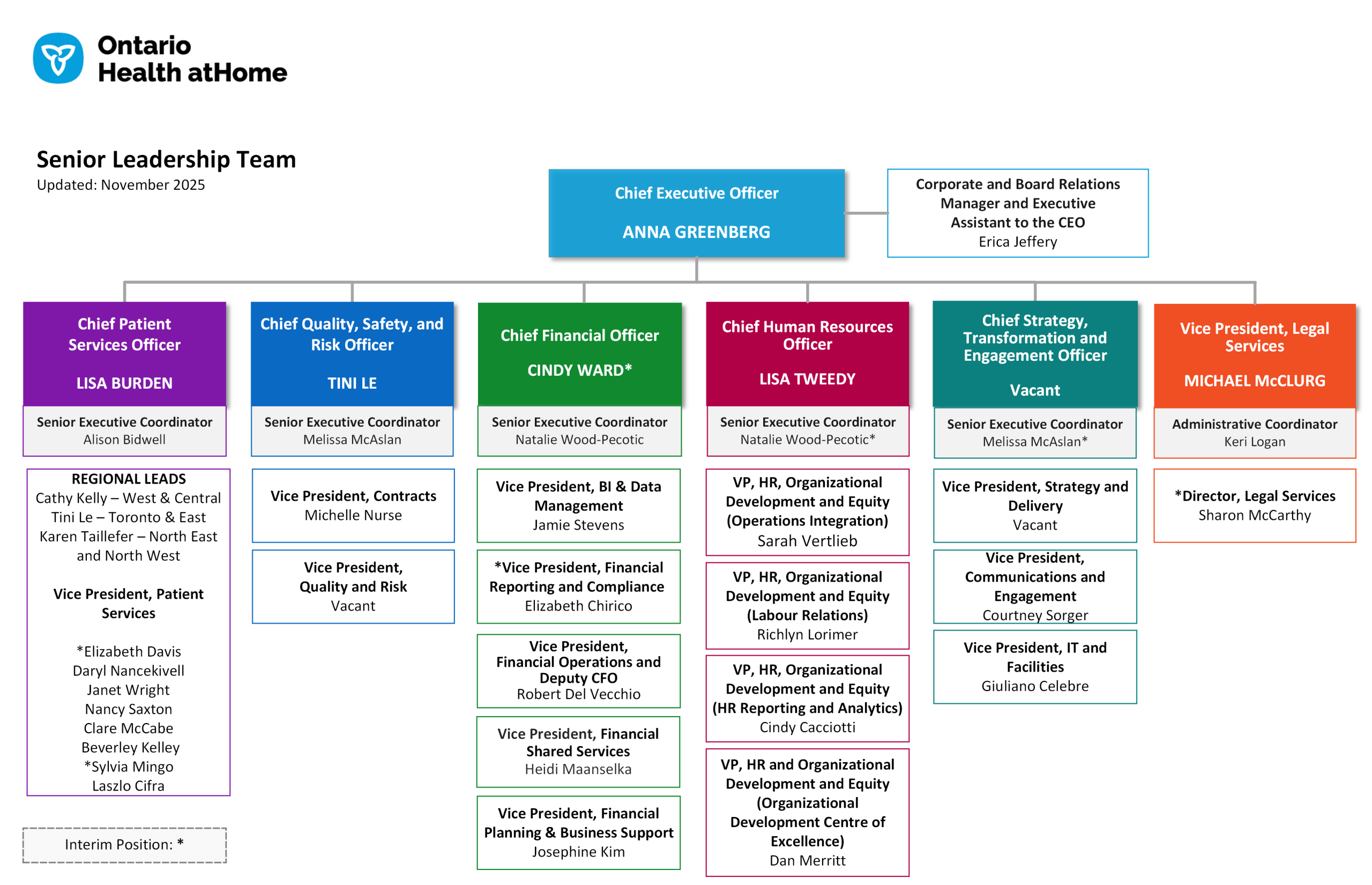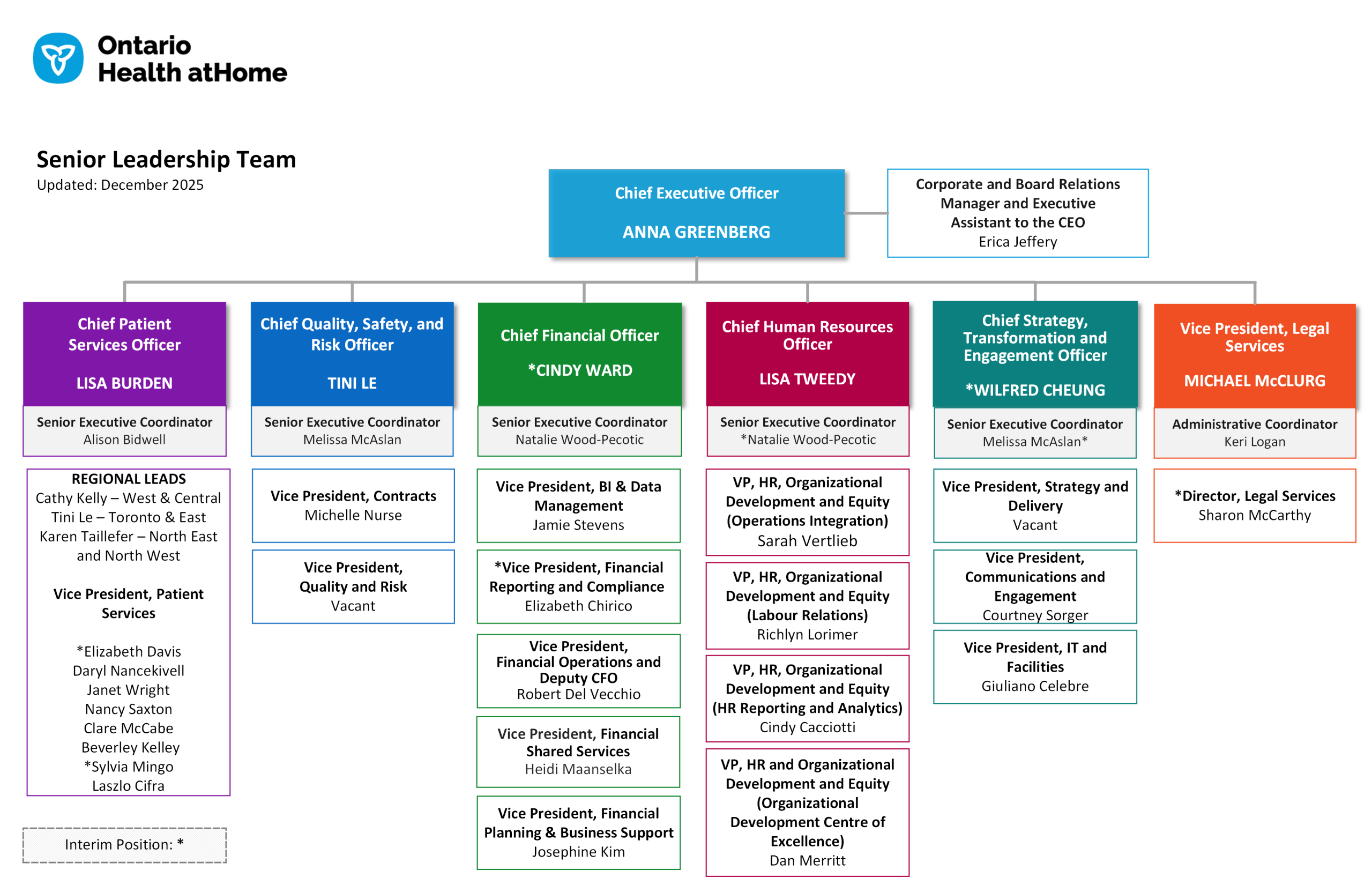 The Strategy, Transformation and Engagement portfolio provides leadership for home care modernization through planning, change management, and collaboration with partners. The team promotes access to care while preparing leaders, staff, partners, patients, families and caregivers for the future. The portfolio includes information technology, facilities management and communications services, which are essential to support modern digital service delivery and seamless patient care. The team ensures patients, families, caregivers and community partners – including Francophone and Indigenous communities – stay informed and engaged, while helping the organization listen and respond to their needs. Together, these efforts strengthen the organization’s ability to deliver innovative, person-centred home care across Ontario.